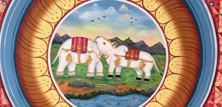 Les couleurs utilisées pour sa décoration rouge, vert et or, symbolisent le bonheur, la pureté.