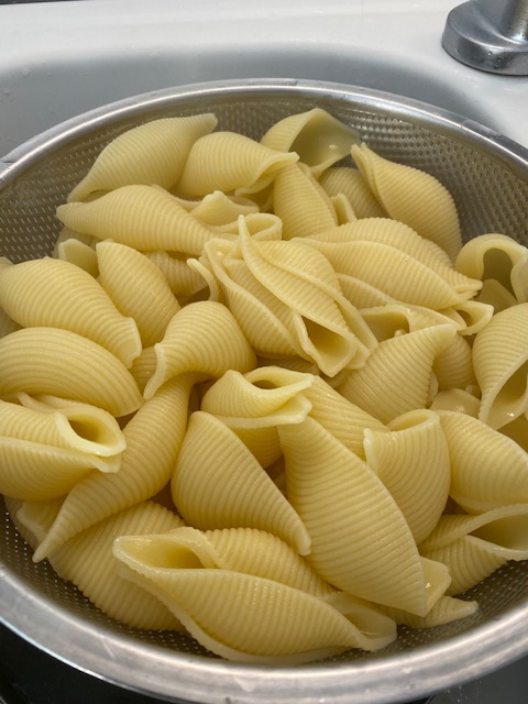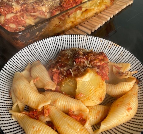 - Faites cuire les conchiglioni rigati dans un grand volume d’eau salée. Environ 10 minutes pour 500 grammes de pâtes. Egoutez-les et versez-les dans un grand plat à gratin.
