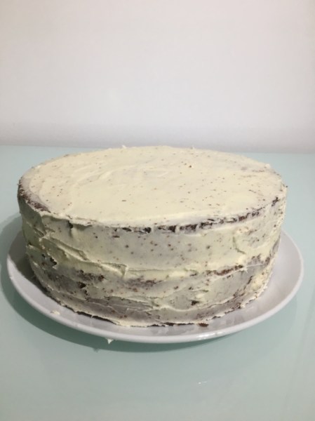 2. Ensuite répartir le reste de glaçage sur les dessus du deuxième niveau puis étaler le uniformément à l’aide d’une spatule.