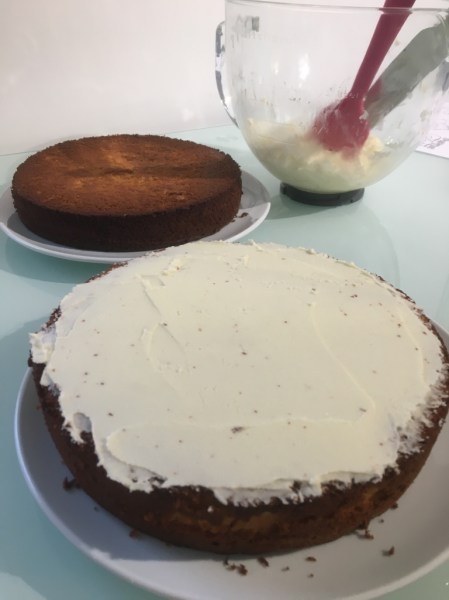 1. Pour fourrer et glacer un gâteau, il suffit de répartir la moitier du glaçage sur le premier niveau à l’aide d’une spatule afin de la répartir uniformément puis placer le deuxième niveau par dessus.