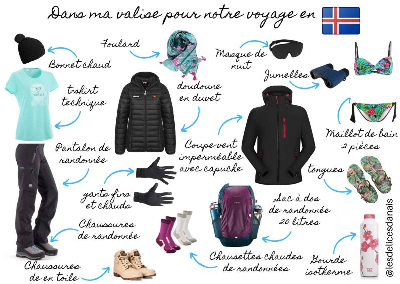 En Islande, la météo peut varier rapidement passant du meilleur au pire en quelques heures. La préparation des valises est donc très importante. Sachant que la température maximale en été ne dépasse pas 19 °C, il faut bien se préparer. Nous avons eu la chance de faire une randonnée en short mais nous avons été très contents d’avoir apporter des vêtements d’hiver pour notre visite du Parc national de Vatnajokull.