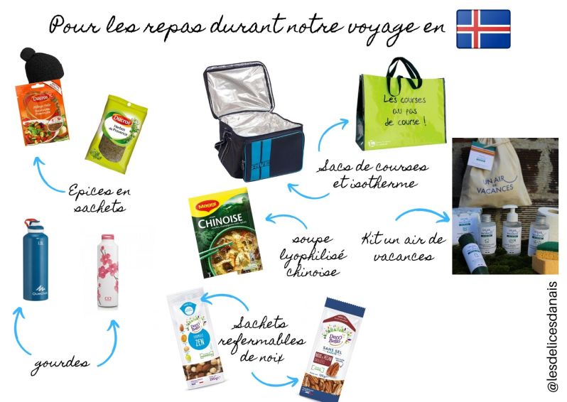Nous nous sommes tout d’abord équipé de sacs de courses (grands et solides) et d’un sac glacière pour le transport de nourriture d’une location à l’autre.