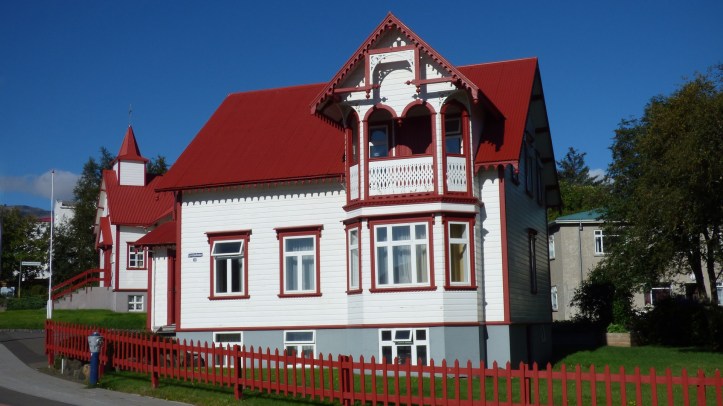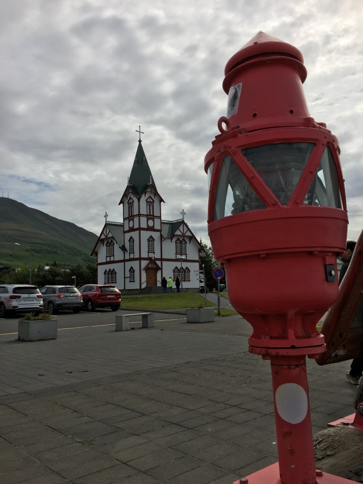 Nous avons faite une balade sur le port et dans les rues de la ville aux maisons colorées. Nous nus sommes arrêté à Húsavíkurkirkja, l’église d’Húsavík. Reconnaissable de loin, cette églaise aux murs blanc, aux fenêtres à bordures rouges et à la toiture verte a été construite en 1907 avec du bois norvégien.