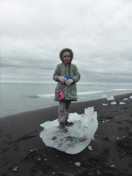 Elle a choisi la plage de Diamon Beach et ses blocs géants de glace échoués sur le sable noir. C’est son moment préféré car elle a pu jouer avec d’énormes glaçons. Ce n’est pas tous les jours que l’on peut grimper sur un bloc de glace comme celui-la.