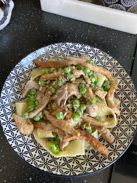 - Égouttez et réservez les pâtes puis les petits pois.