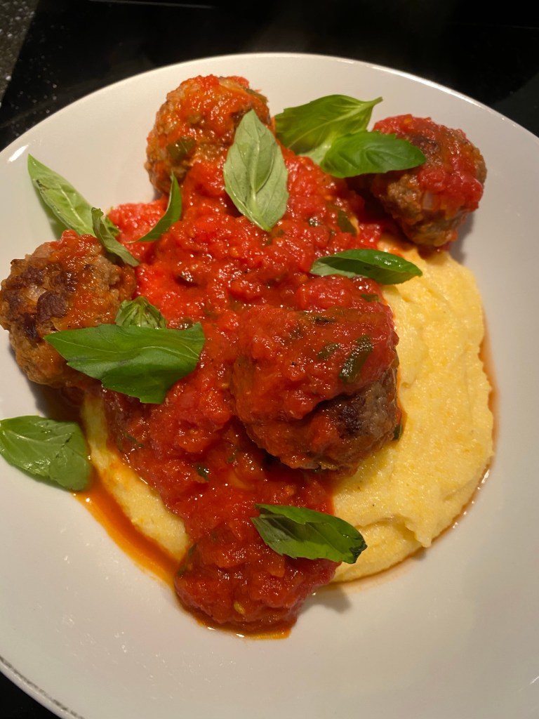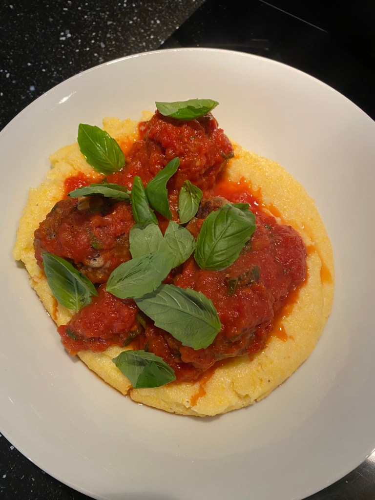 5. Servir la polenta, puis ajoutez les boulettes et la sauce tomate, salez, poivrez, ajoutez un peu de basilic frais.
