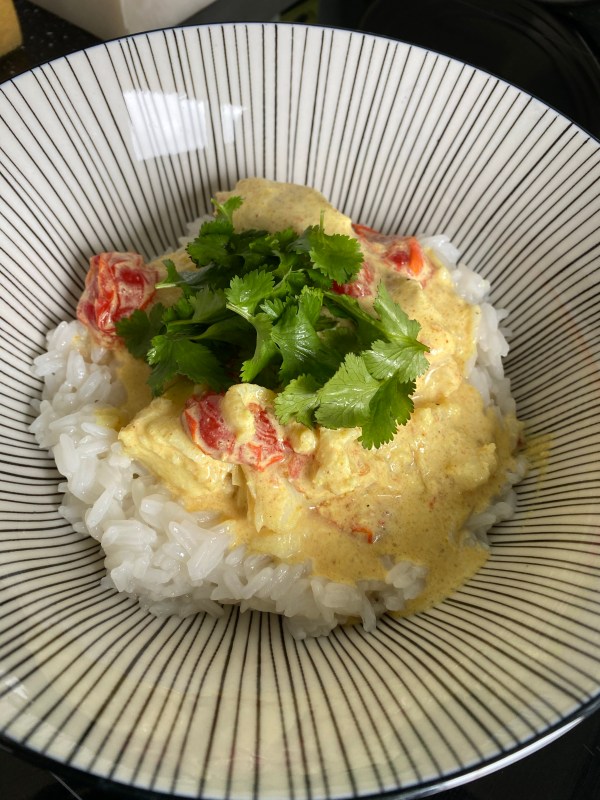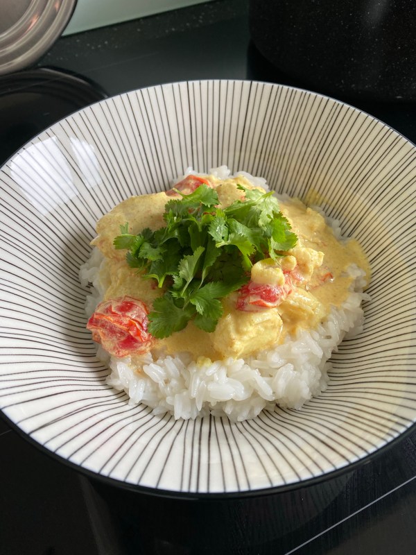 - Servir le tout sur le riz, et quelques feuilles de coriandre si vous en avez.