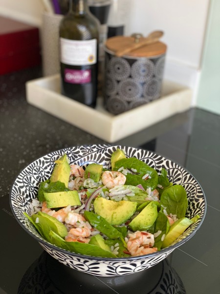 - Dans une assiette, ajoutez le riz, les pousses d’épinard, les avocats, les oignons rouges, les crevettes. Ajoutez un filet d’huile d’olive, le jus du citron vert, salez et poivrez.