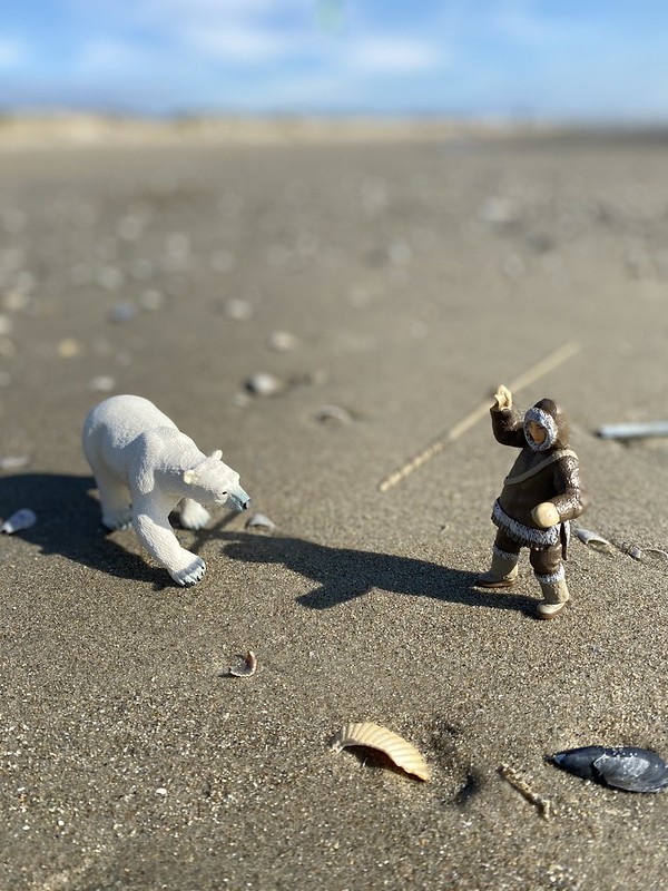 Les filles avaient apporté les dernières figurines reçues de la marque de jouet Papo sur le thème de la banquise, nous avons donc pu les mettre en scène dans de superbes décors de sable.