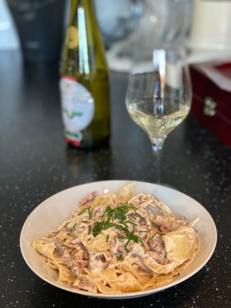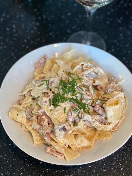- Ajoutez l’ail et les champignons, faire revenir 5 minutes. Ajoutez le vin et la crème, poivrez (les lardons sont déjà salés). Portez à ébullition.