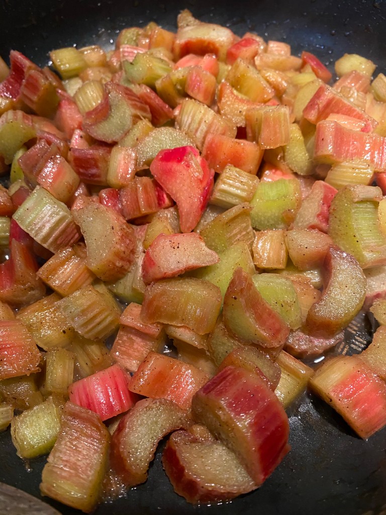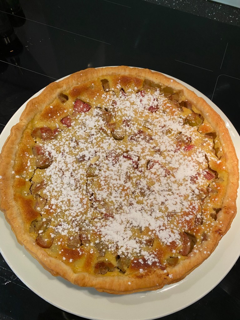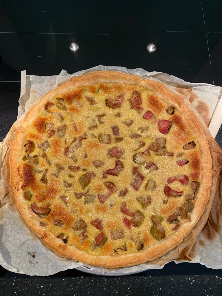 - Répartissez la rhubarbe sur le fond de tarte et versez l’appareil dessus.