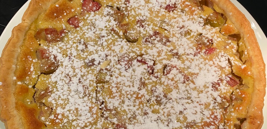 - Répartissez la rhubarbe sur le fond de tarte et versez l’appareil dessus.