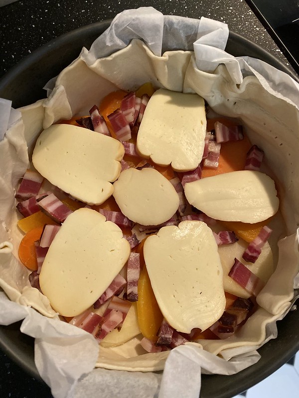 - Recouvrez-les de lardons et ajoutez quelques lamelles de fromage.