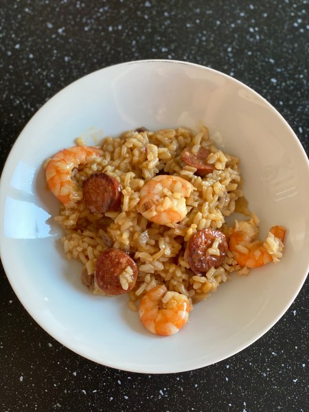 Voici une #recette de risotto aux crevettes et chorizo qui devrait vous fera voyager entre terre et mer.