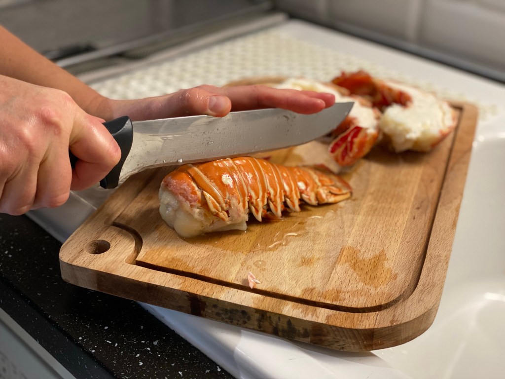 6. Avant dégustation, écoutez vos langoustes, coupez les queues en deux dans le sens de la longueur. Réservez-les au frais.