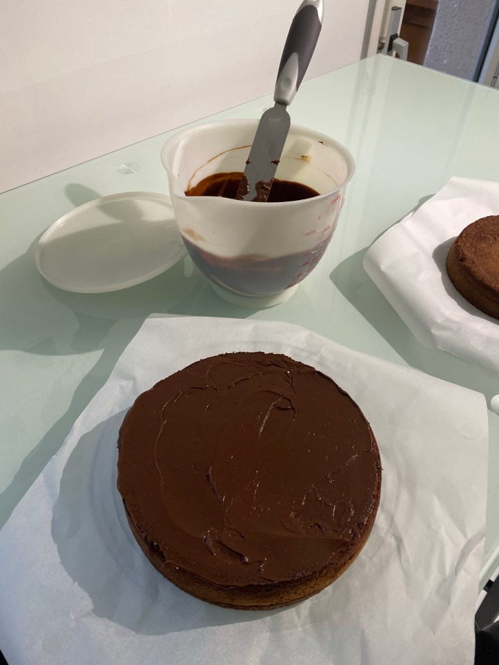 J’ai fait cuir ma préparation dans des moules à gâteaux standards. Je les ai ensuite laissé refroidir avant de les fourrer avec la ganache au chocolat.