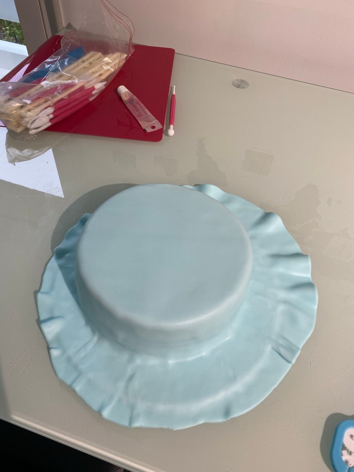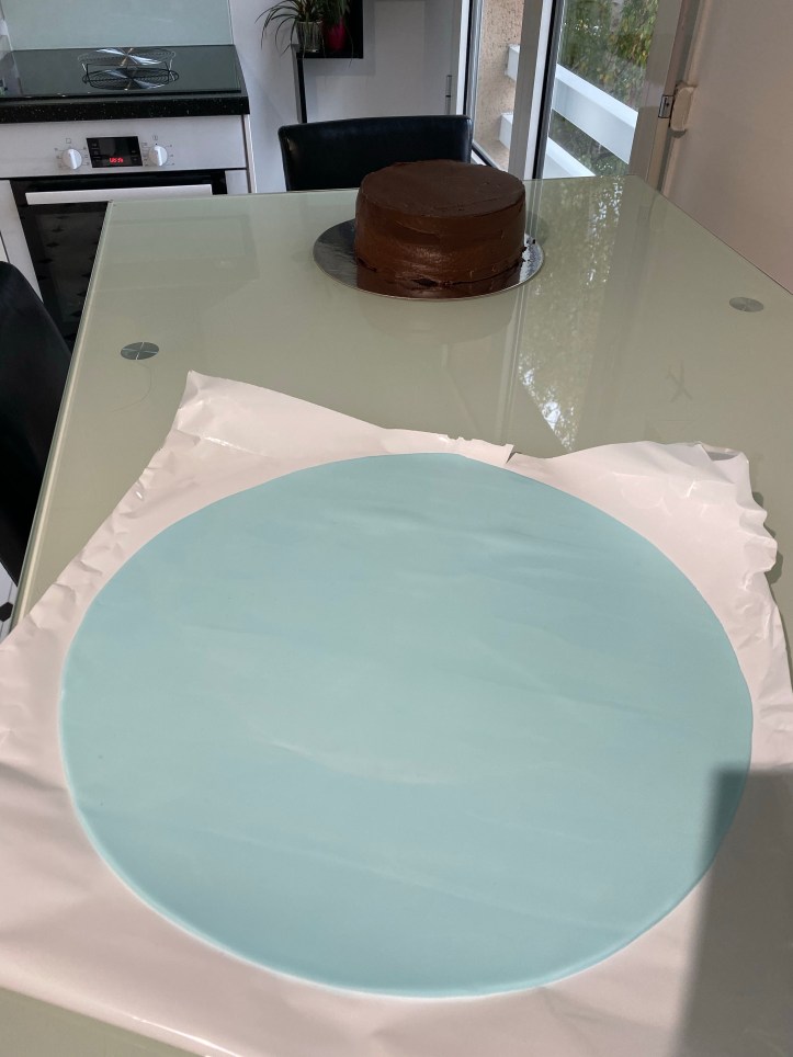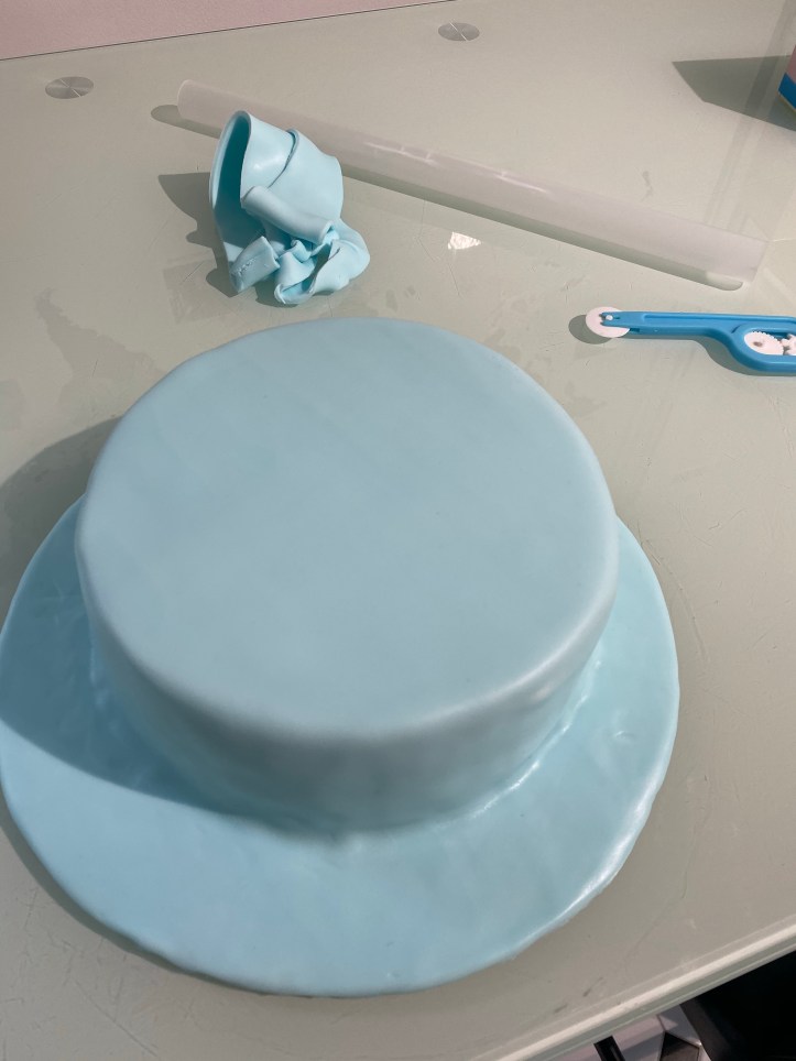 Avant de passer à la décoration, j’ai recouvert mon gâteau de pâte à sucre bleue.