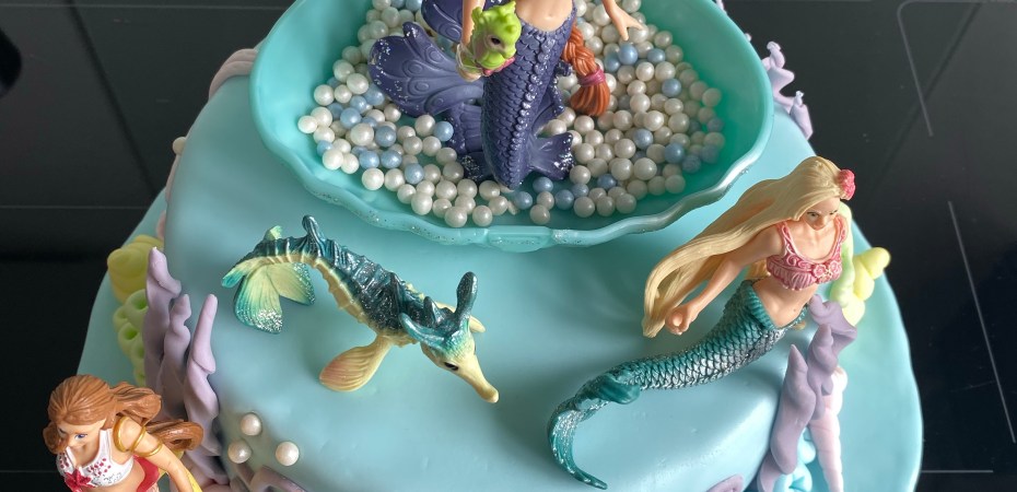 Si m’a puce a demandé un gâteau sur le thème des sirènes, c’est parce qu’elle a maintenant une costume de sirène pour pratiquer l’apnée en piscine.