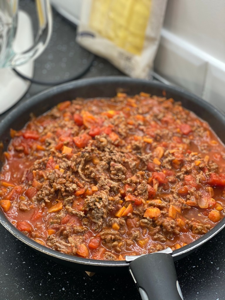 - Pour préparez la sauce à la bolognaise, faites chauffer un filet d’huile dans une grande casserole à feu moyen et faites revenir la carotte et l’oignon haché avec la pancetta coupée en petits morceaux. Ajoutez la viande hachée et faites revenir. Versez la tomate, salez et livrez selon votre goût. Couvrez et laissez mijoter à couver pendant 30 minutes.