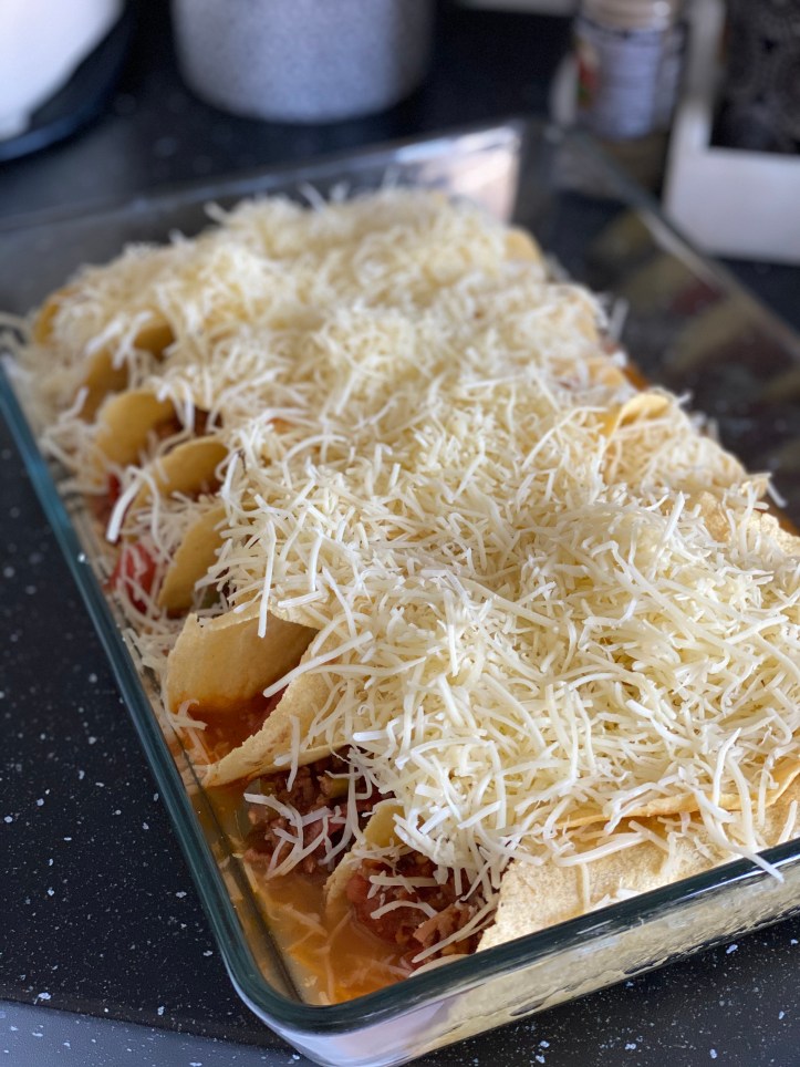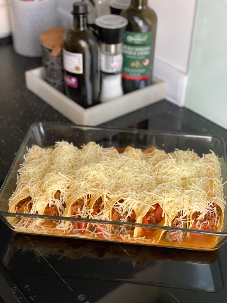 - Garnissez chaque tortilla avec la préparation et roulez-les et disposez-les côte à côte dans un plat à gratin beurré. Versez le reste de sauce sur le tout et parsemez de fromage râpé.