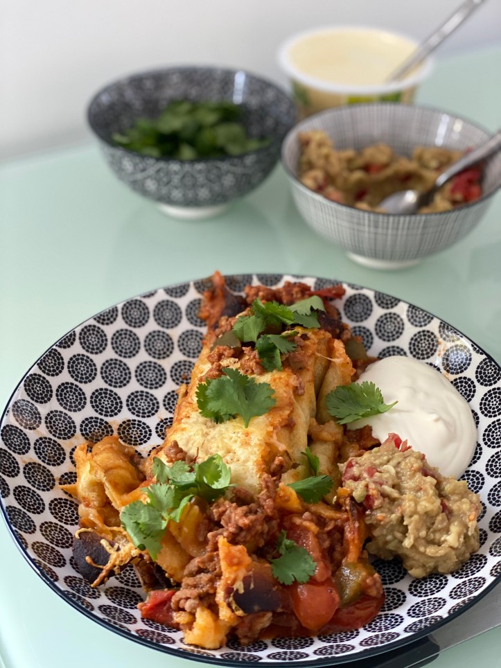 Les enchiladas sont un incontournables de la cuisine mexicaine. Elles sont réalisées à partir d’un mélange de bœuf haché, de tomates, de poivrons et d’épices mijotés que l’on enroule dans des tortillas de maïs avant de les passer au four pour les faire gratiner. On les sert accompagnées de guacamole et de crème fraîche épaisse.