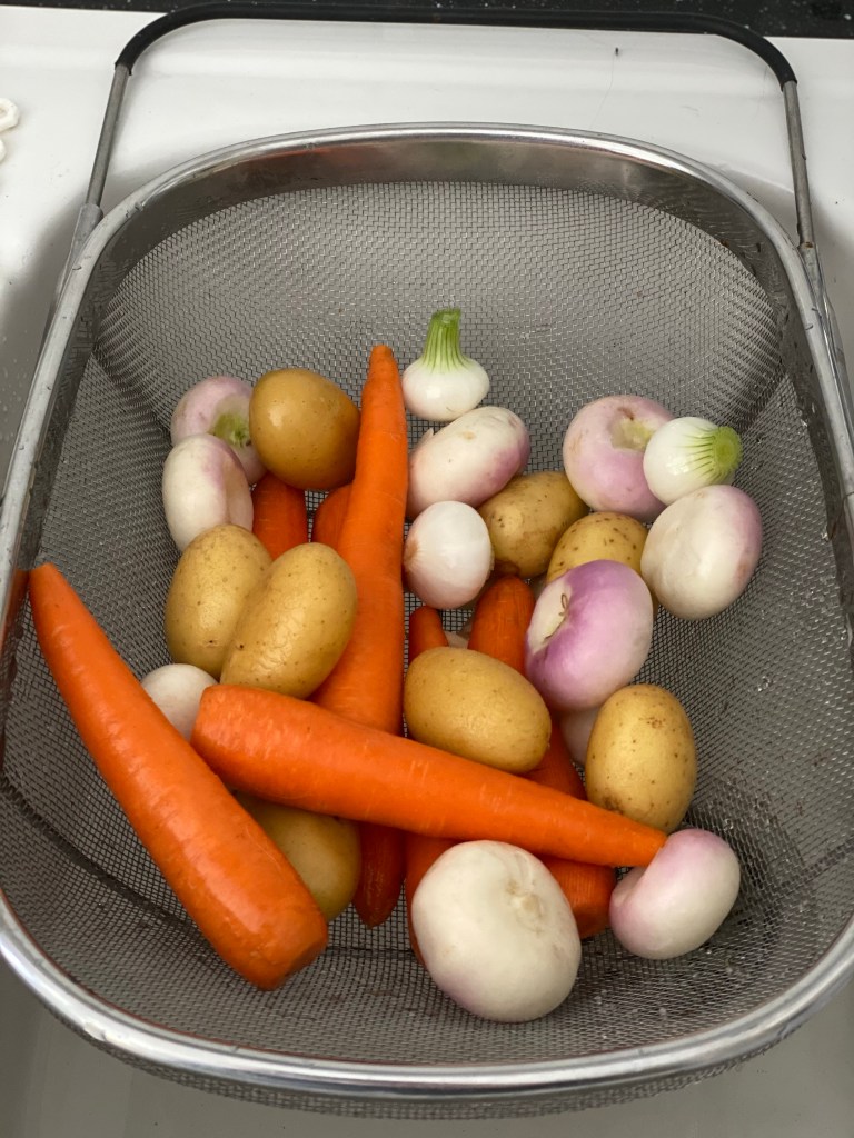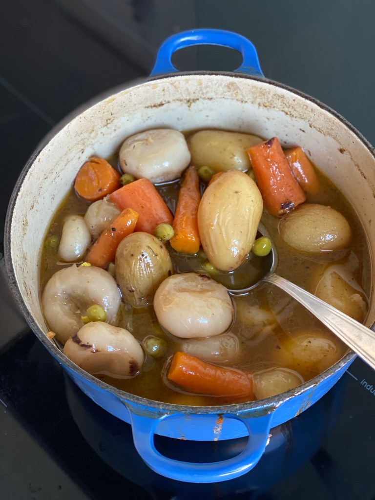 - Des légumes nouveaux : 4 carottes, 8 petites pommes de terre de type grenaille, 8 petits navets nouveau, une poignée de petits pois frais et 4 oignons nouveaux.
