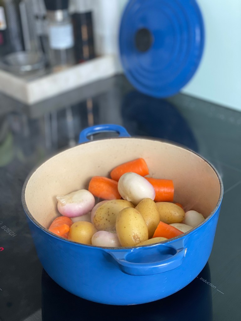 - Déposez le rôti dans la cocotte et répartissez les légumes autour.