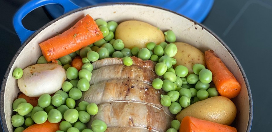 Au mois de mai les légumes nouveaux font leur apparition sur les étales : oignons, navets, carottes, pommes de terre et petits pois font un mélange idéal pour accompagner un rôti en cocotte.