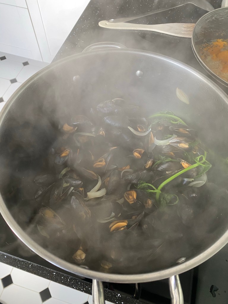 - Ajoutez les moules puis la coriandre et couvrir. Laissez cuire 2 minutes environ et stopper la cuisson à partir du moment où les moules sont ouvertes.