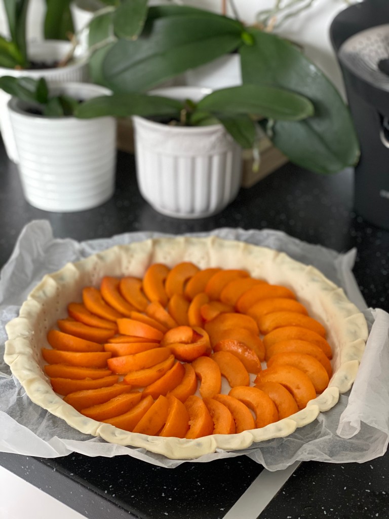 - Ranger les morceaux d’abricots sur le fond de tarte et versez ensuite l’appareil dessus.