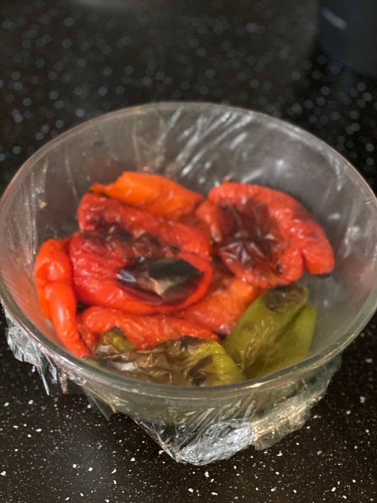 3. Déposez les poivrons cuits dans un saladier puis recouvrez le de film plastique afin qu’il transpire cela permettre de retirer plus facilement la peau.