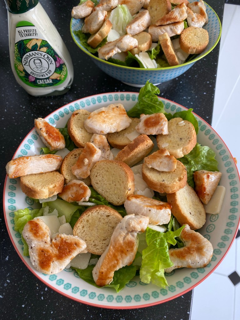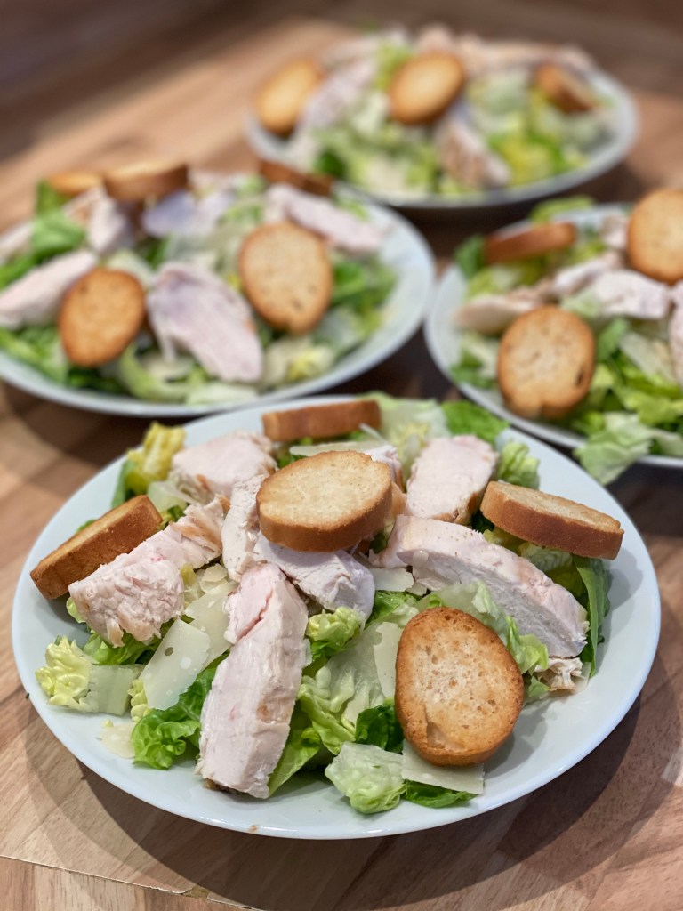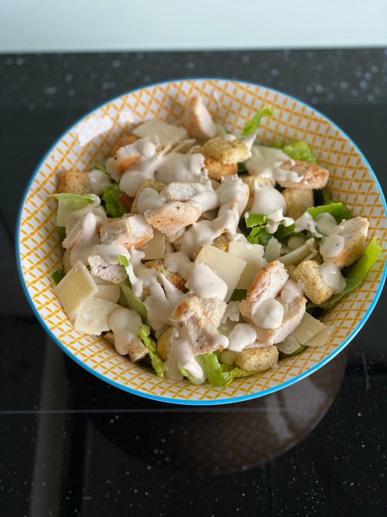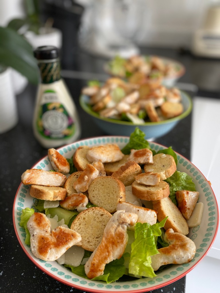 - Déposez ensuite les morceaux de poulet, les croûtons et les copeaux de parmesans. Ajoutez encore un peu de sauce par dessus. Servez sans attendre.