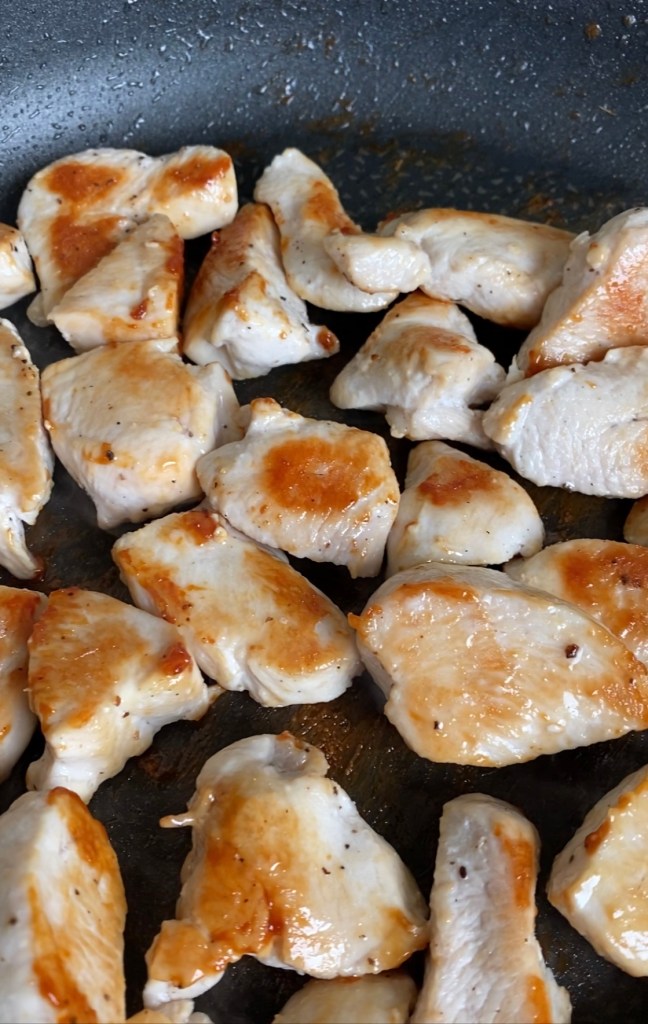 - Dans une poêle chaude, versez un filet d’huile d’olive et faites cuir les escalopes de poulet jusqu’à’ ce qu’elles soient bien dorées. Découpez les filets en morceaux et réservez.