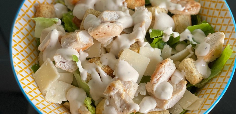 - Déposez ensuite les morceaux de poulet, les croûtons et les copeaux de parmesans. Ajoutez encore un peu de sauce par dessus. Servez sans attendre.