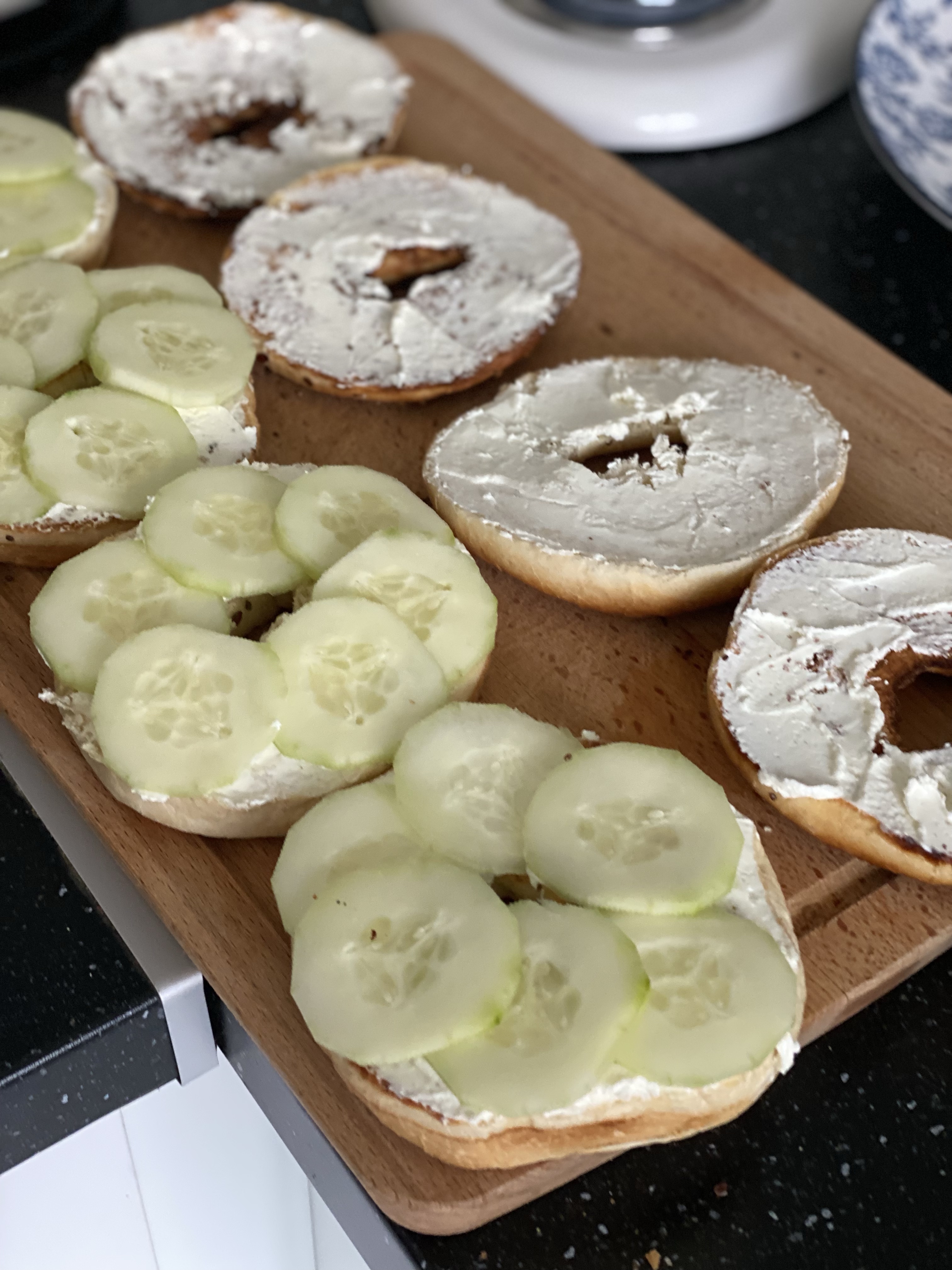 - Épluchez et tranchez le concombre puis déposez les tranches sur une face du bagel.