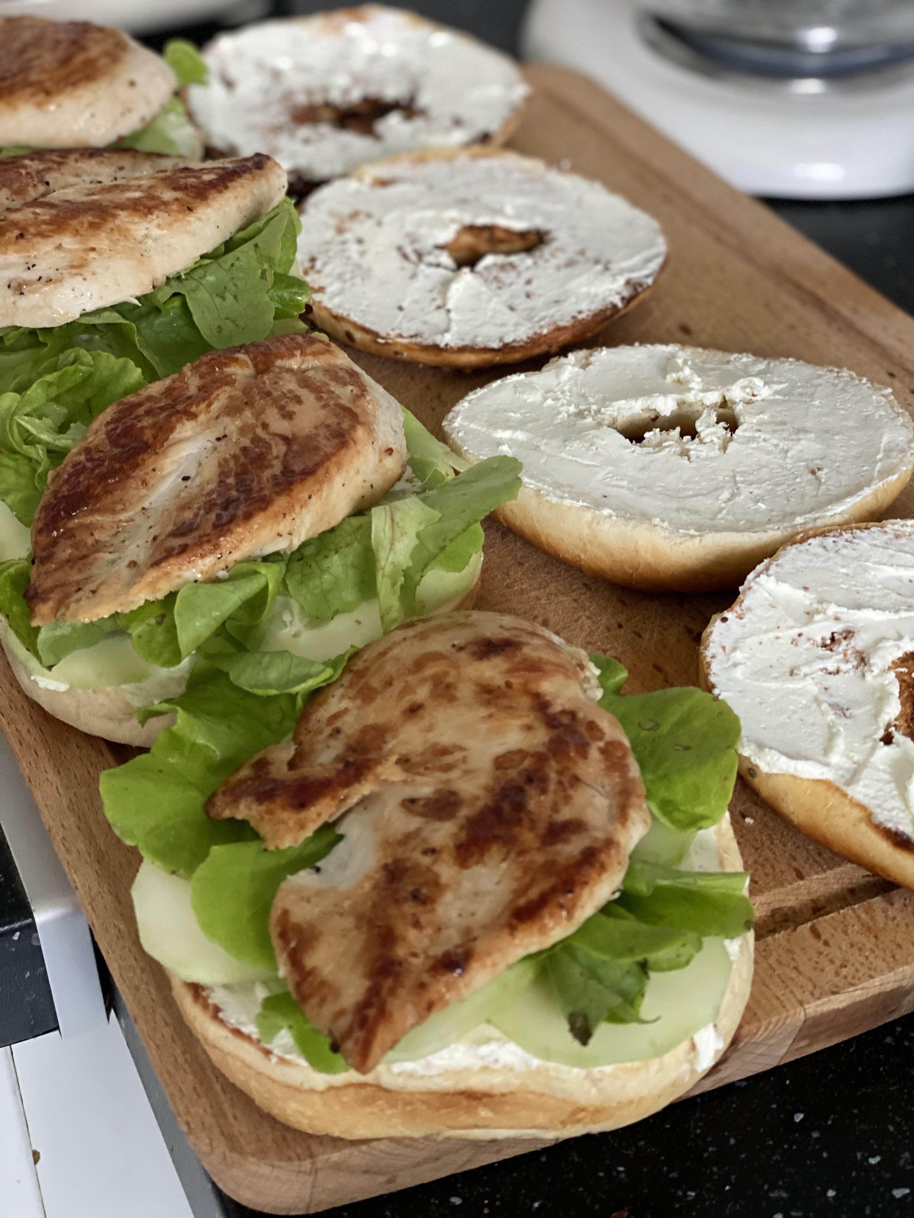 - Cuisez les morceaux de poulet à la poêle dans un filet d’huile et lorsqu’ils sont bien cuits et dorés, coupez les en morceaux avant des les déposer dans les bagels.