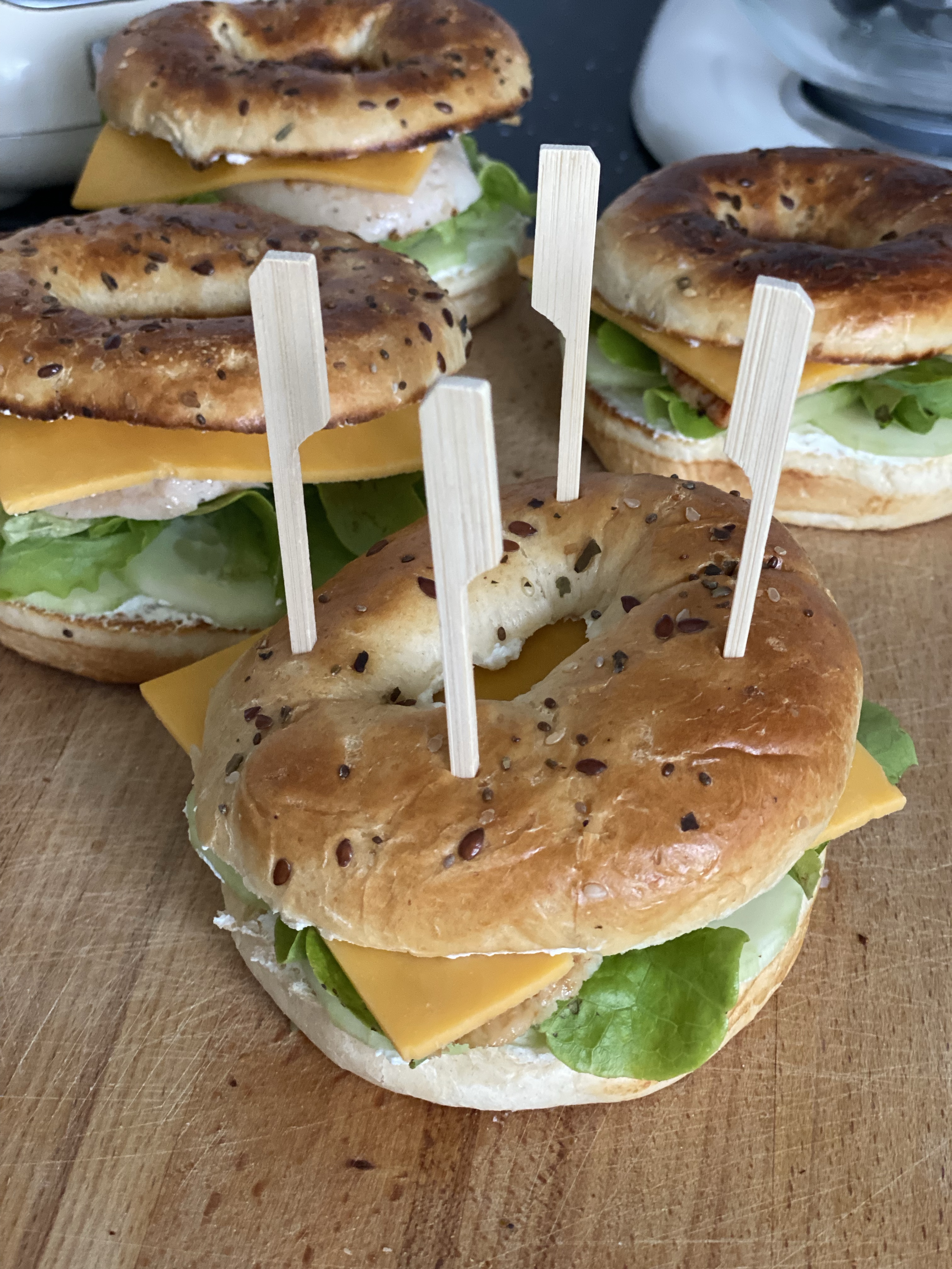 - Si vous souhaitez proposer ces bagels à l’apéro. Piquez le bagel de 4 piques et poupée-le à l’aide d’un couteau à pain. le pique permet de garder la garniture en place et d’attraper plus facilement le morceau de bagel sans y mettre les mains !
