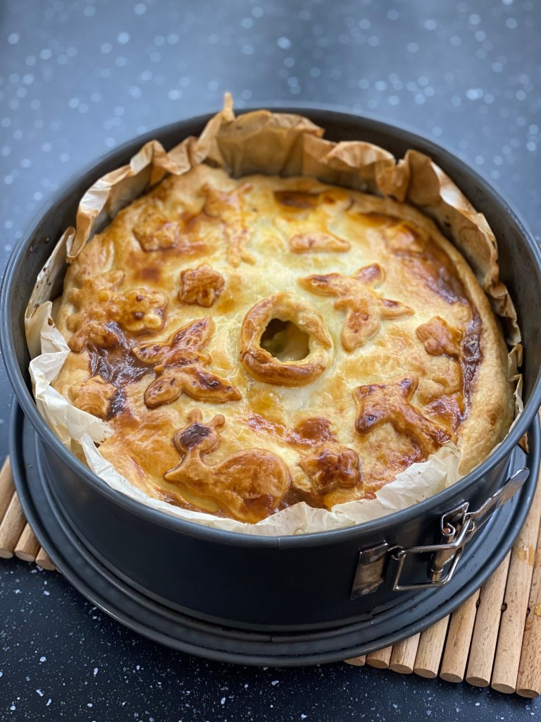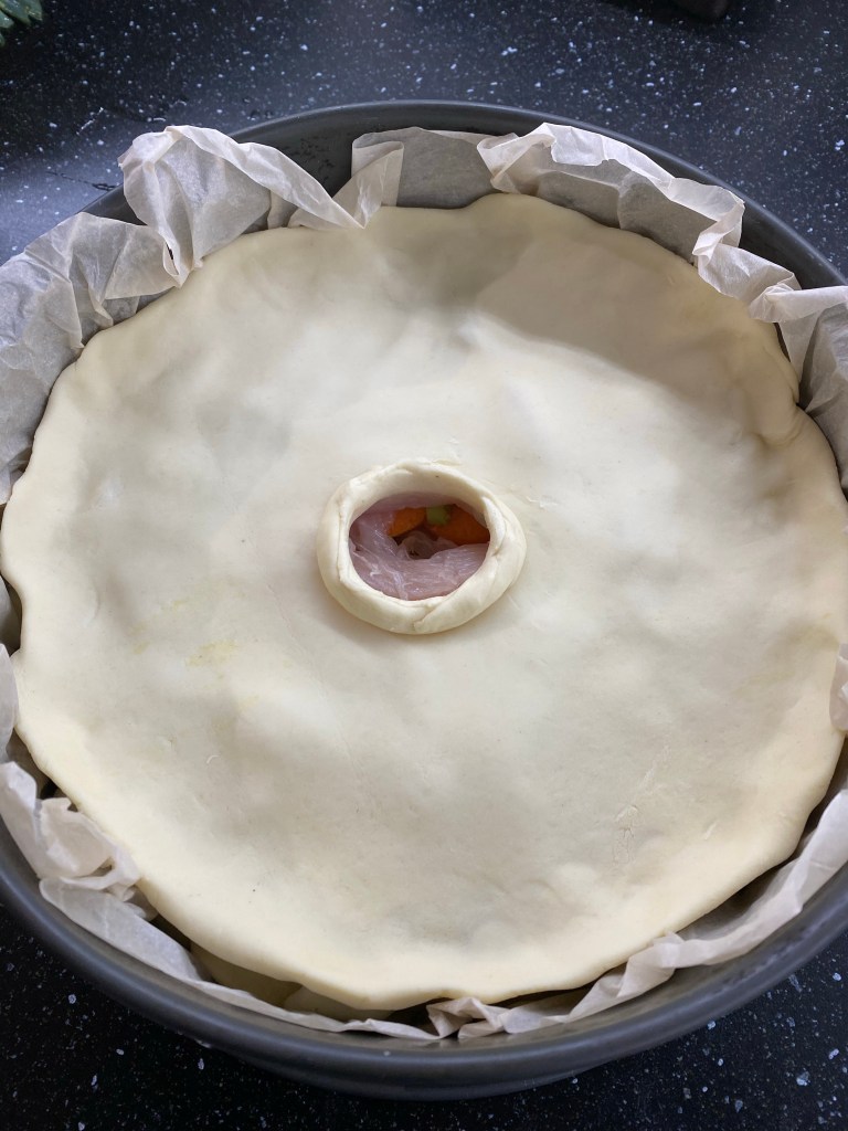 - Déroulez la deuxième pâte feuilletée et recouvrez le moule en pressant les bords pour les souder. Découpez une ouverture pour laisser s’échapper la vapeur de cuisson, au besoin, formez une petite cheminée en papier aluminium pour qu’elle ne se referme pas.