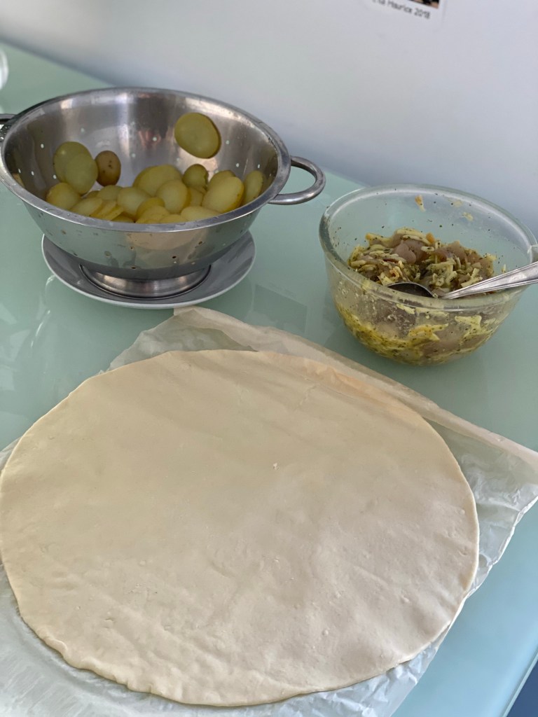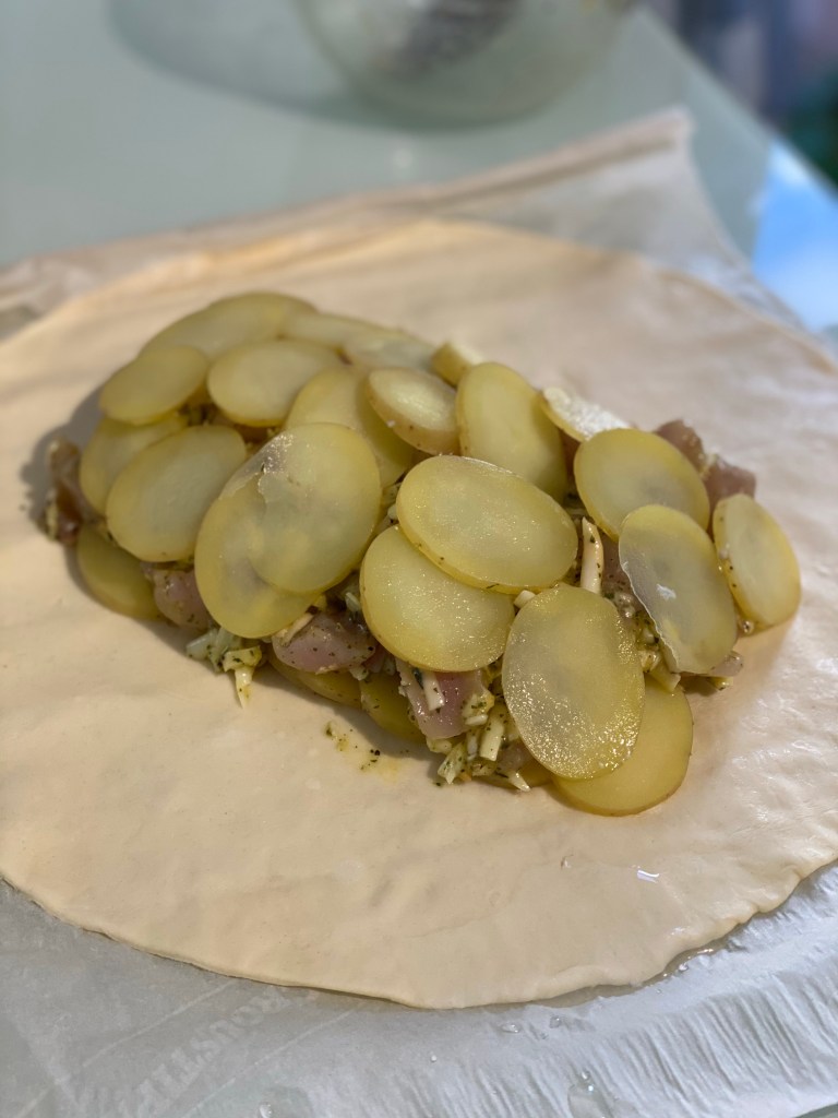 - Rangez les rondelles de pommes de terre au centre de la pâte.