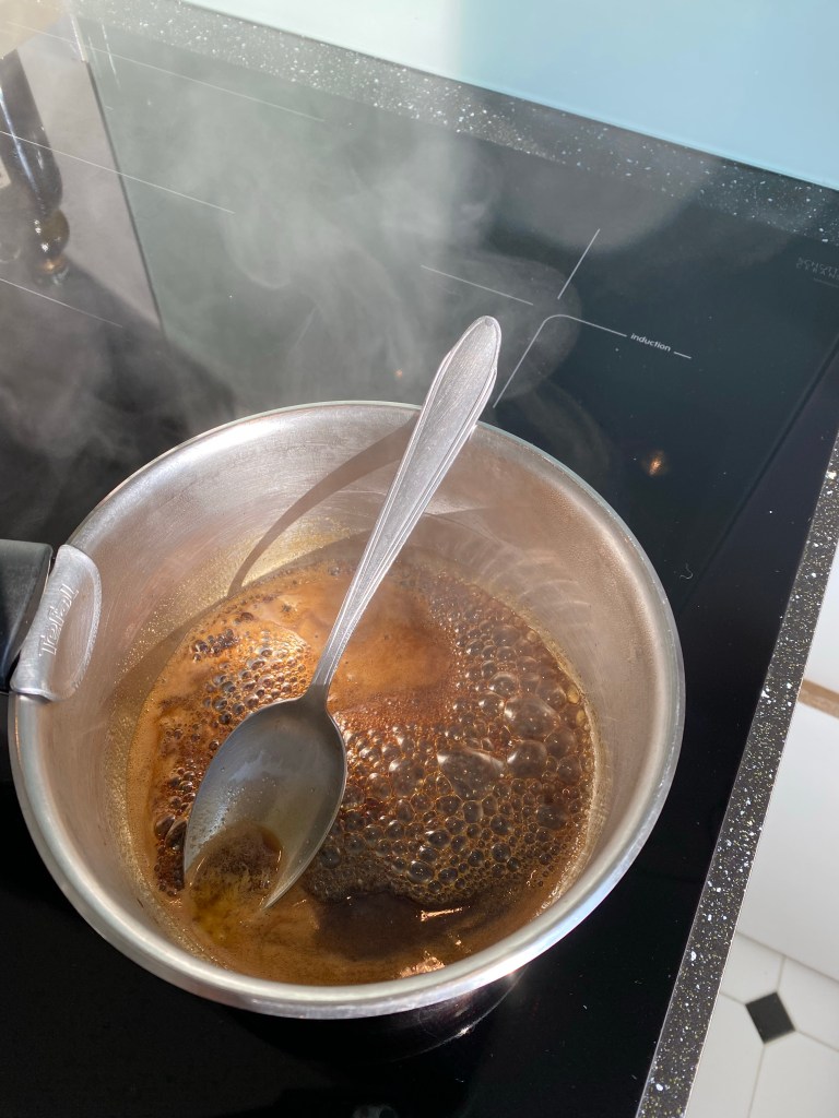 - Dans une casserole chauffée à feu vif versez la sauce soja, le sucre et le beurre. Faites réduire 5 minutes jusqu’à obtenir un caramel. Réservez.