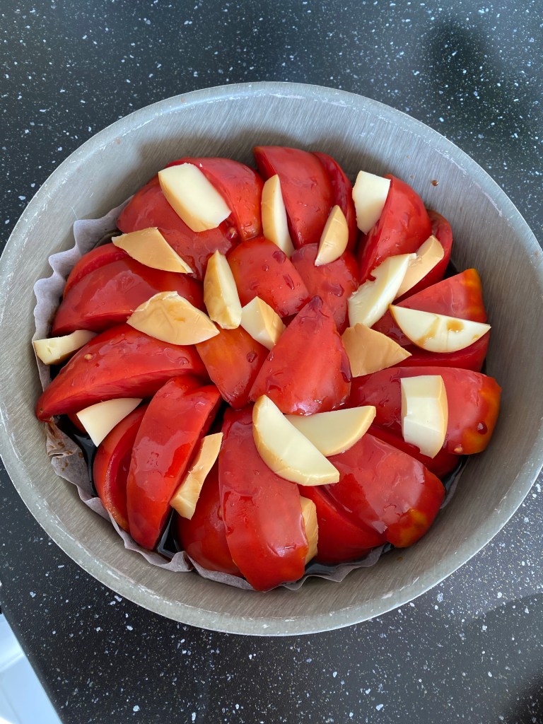 - Lavez les tomates et coupez-les en huit. Disposez une feuille de papier sulfurisé au fond d’un moule à manqué puis alignez les tomates en rangs serrés. Versez le caramel de soja. La papier va faciliter le démoulage.