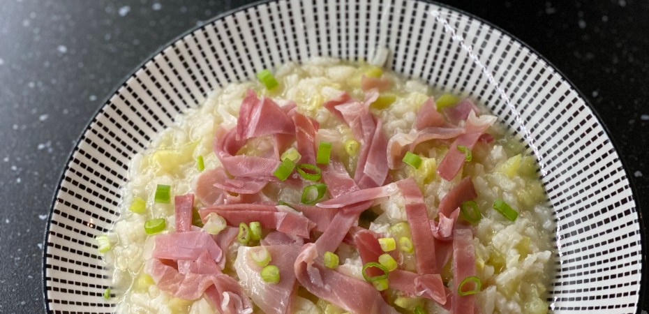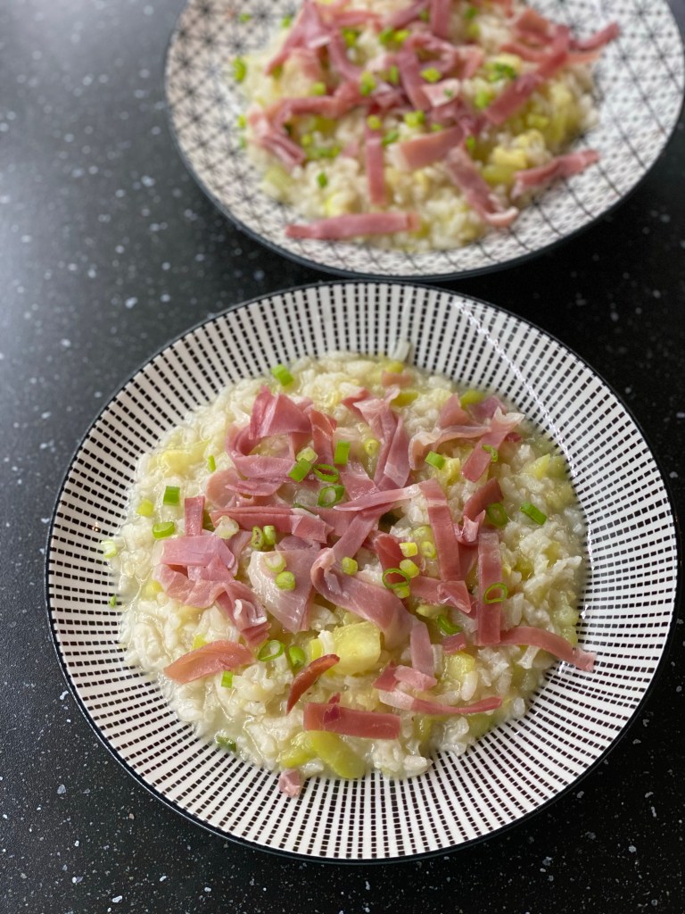 Aujourd’hui nous partons en voyage en Italie avec ce risotto aux courgettes et au jambon cru.