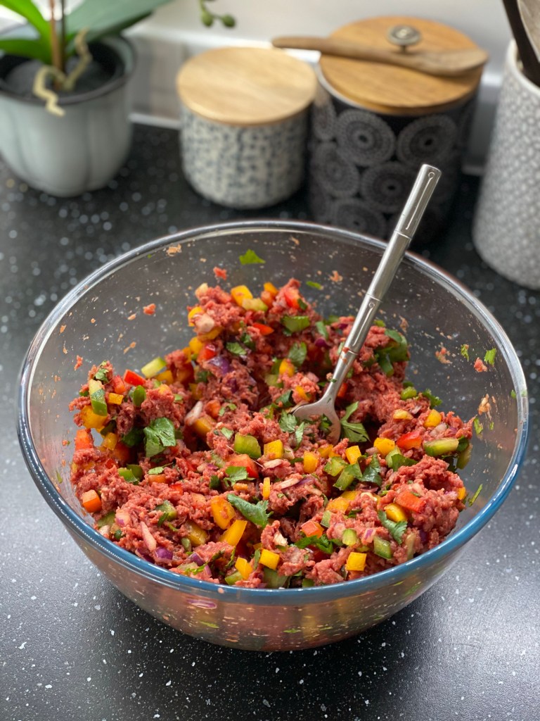 - Hachez les poivrons, le persil et l’oignon finement. Dans un saladier, ajoutez la viande et les légumes hachés, le concentré de tomates, les épices, une pincée de sel et de poivre. Mélangez le tout.