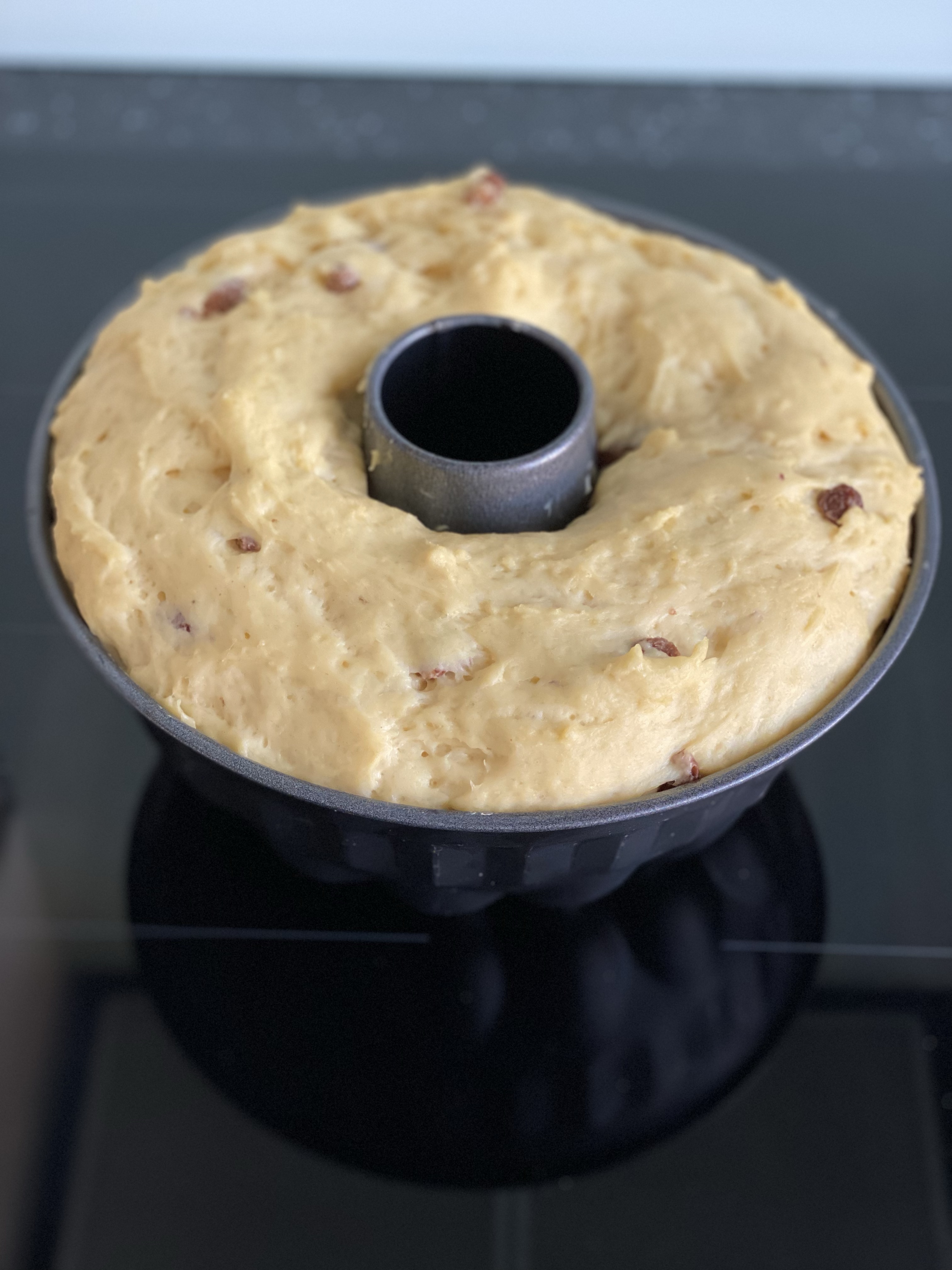 - Beurrez le moule à kouglof jusque dans les cannelures. Déposez une amande dans chaque cannelure. Déposez la pâte et laissez reposer jusqu’à ce qu’elle arrive au bord du moule.