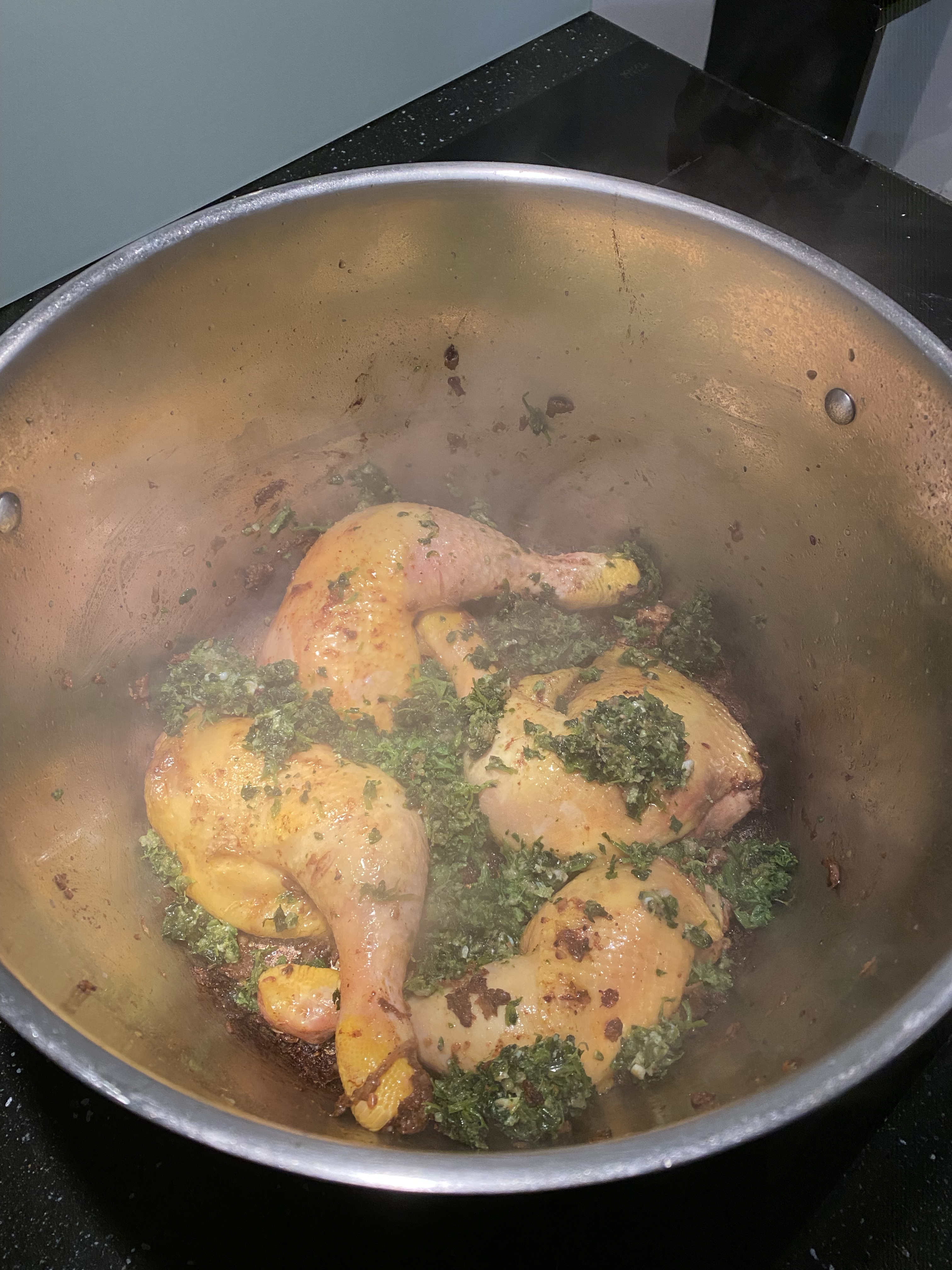 - Ajoutez les cuisses de poulet et faites les dorer sur toutes les faces. Salez et poivrez.