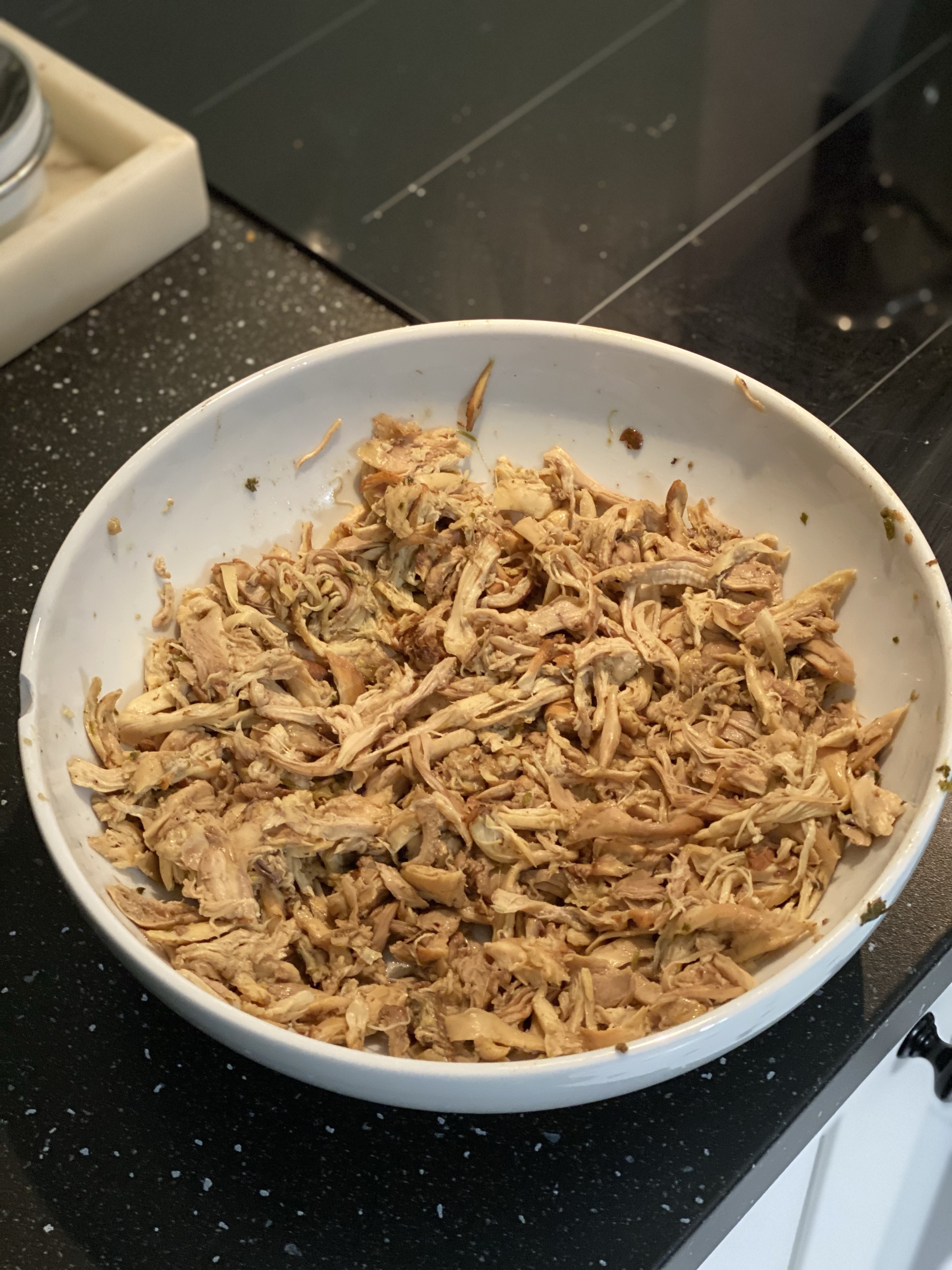 - Pendant ce temps, détachez la viande des os en effilochant la chair et réservez-la.