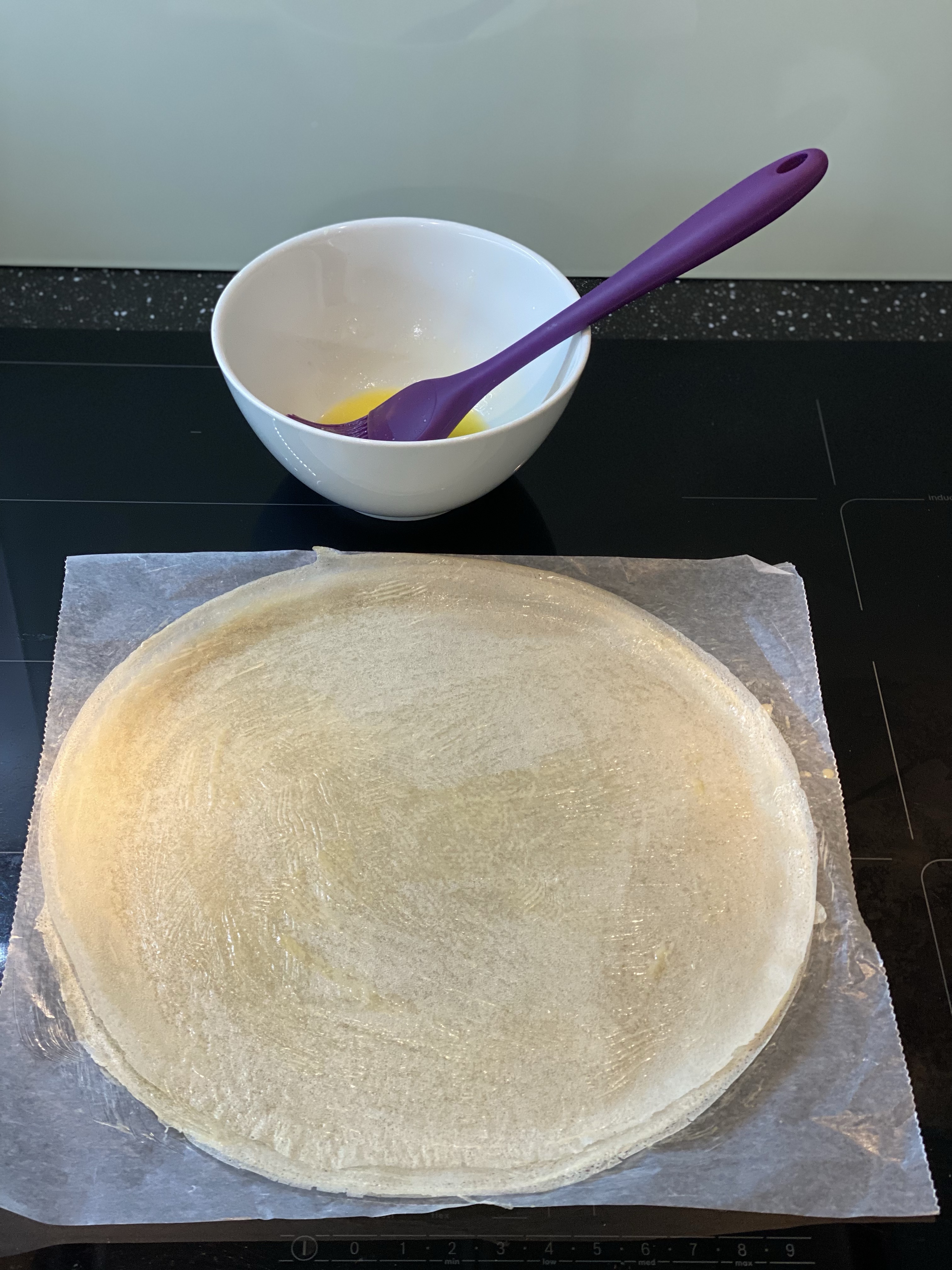 - Beurrez les 4 feuilles restantes et posez-les sur la préparation en la bordant à l’intérieur du moule pour envelopper entièrement l’ensemble.