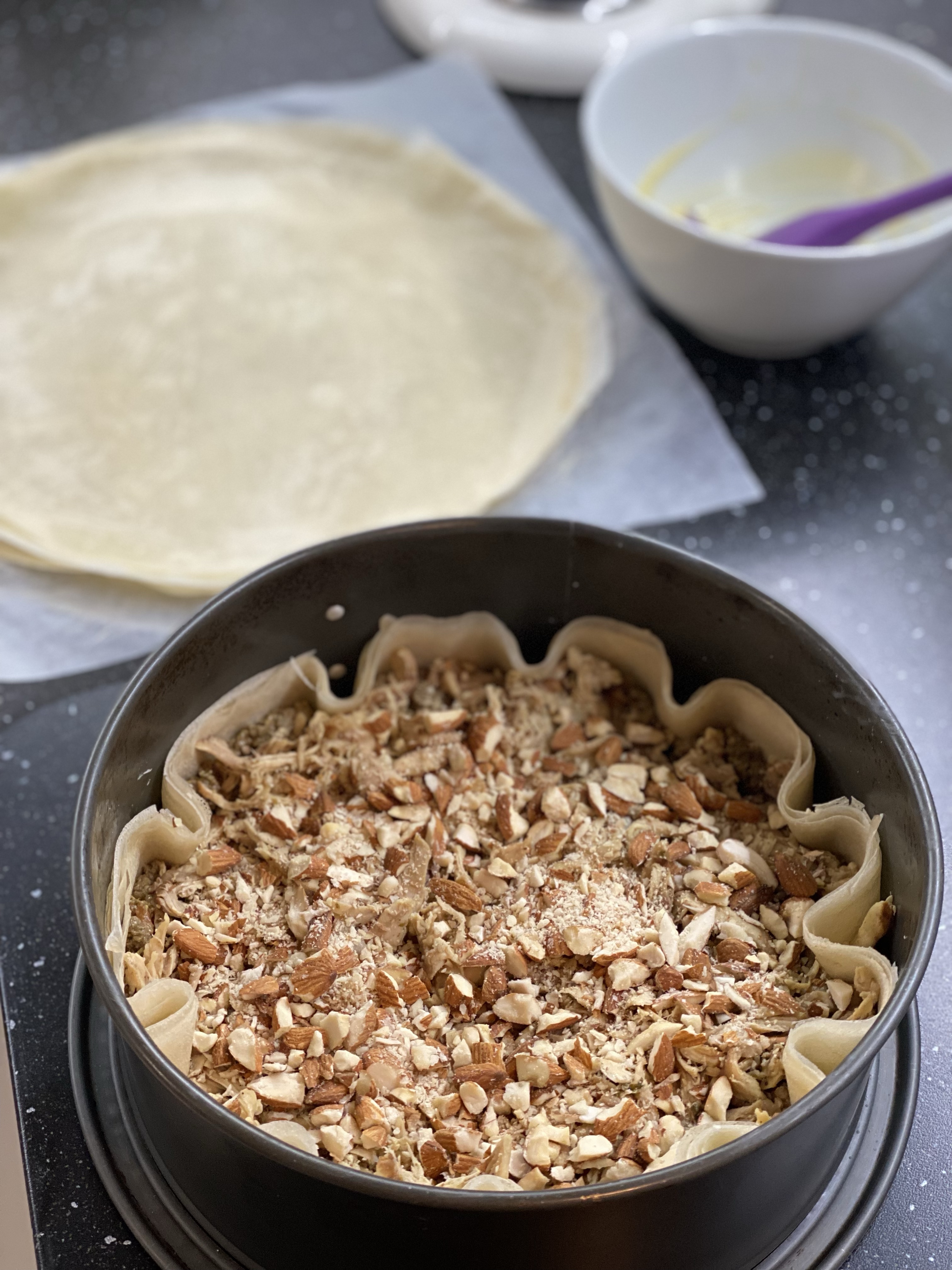 - Garnissez alors le fond avec la préparation aux œufs, la chair de poulet effilochée et les amandes concassées. Repliez les bords des feuilles de brick qui débordent du moule sur la préparation.