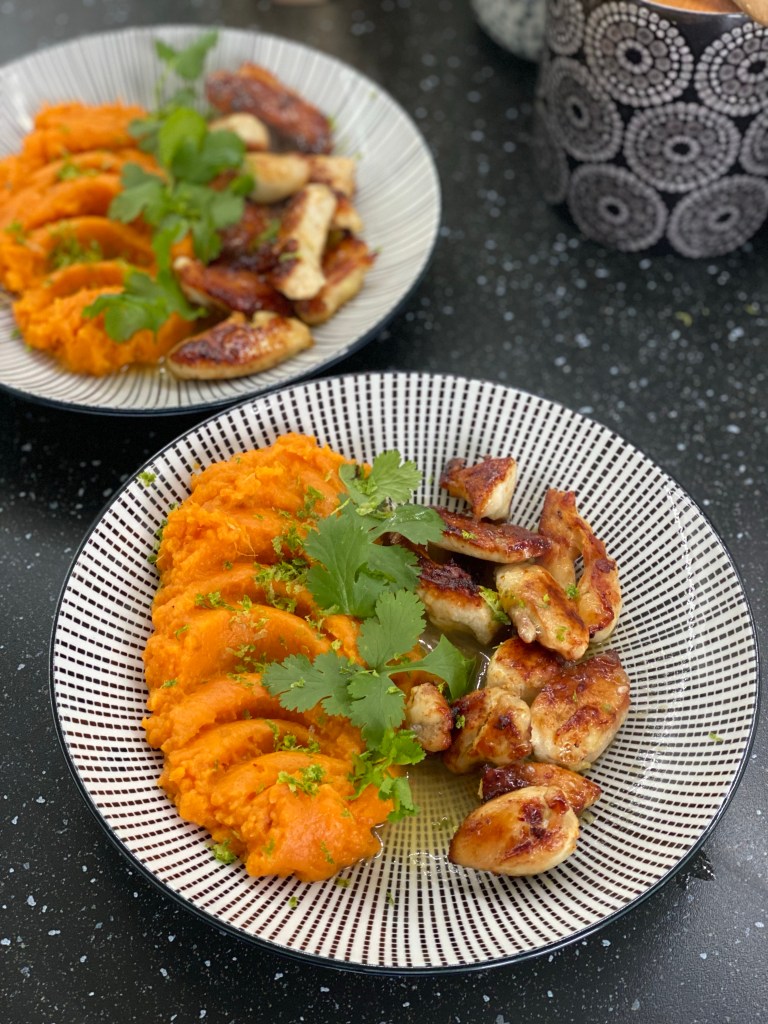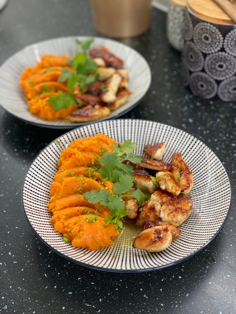 - Dans une assiette, déposez une à deux cuillères de purée de patate douce, ajoutez les morceaux de poulet. Versez un filet de la sauce au citron obtenue dans la poêle. Saupoudrez de zeste de citron et ajoutez quelques feuilles de coriandre fraîche. Servez sans attendre.