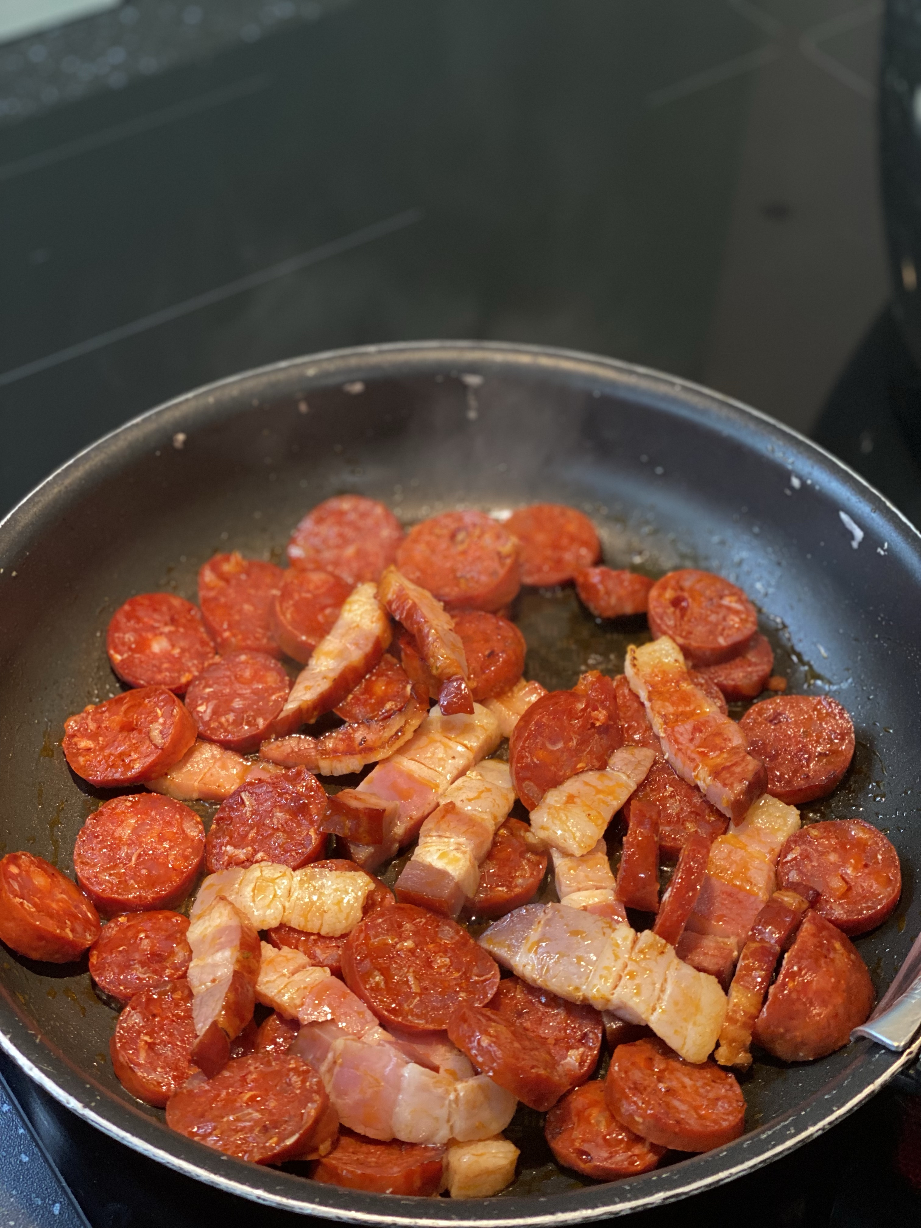 - Coupez le chorizo en rondelles. Dans une poêle, faîtes-le dorer avec les lardons. Puis ajoutez-les dans la marmite et mélangez.